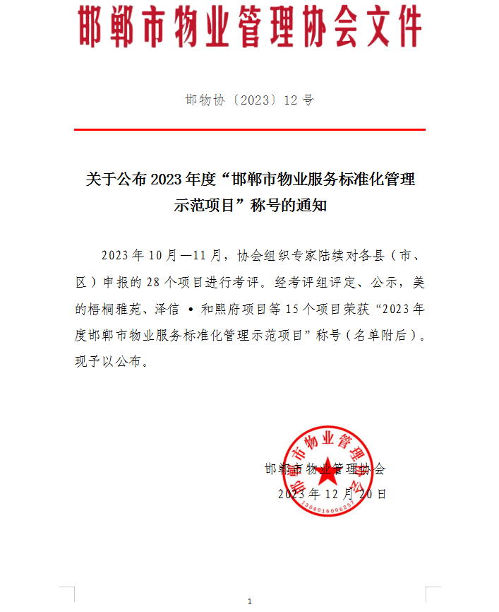 關(guān)于公布2023年度“邯鄲市物業(yè)服務(wù)標(biāo)準(zhǔn)化管理 示范項(xiàng)目”稱(chēng)號(hào)的